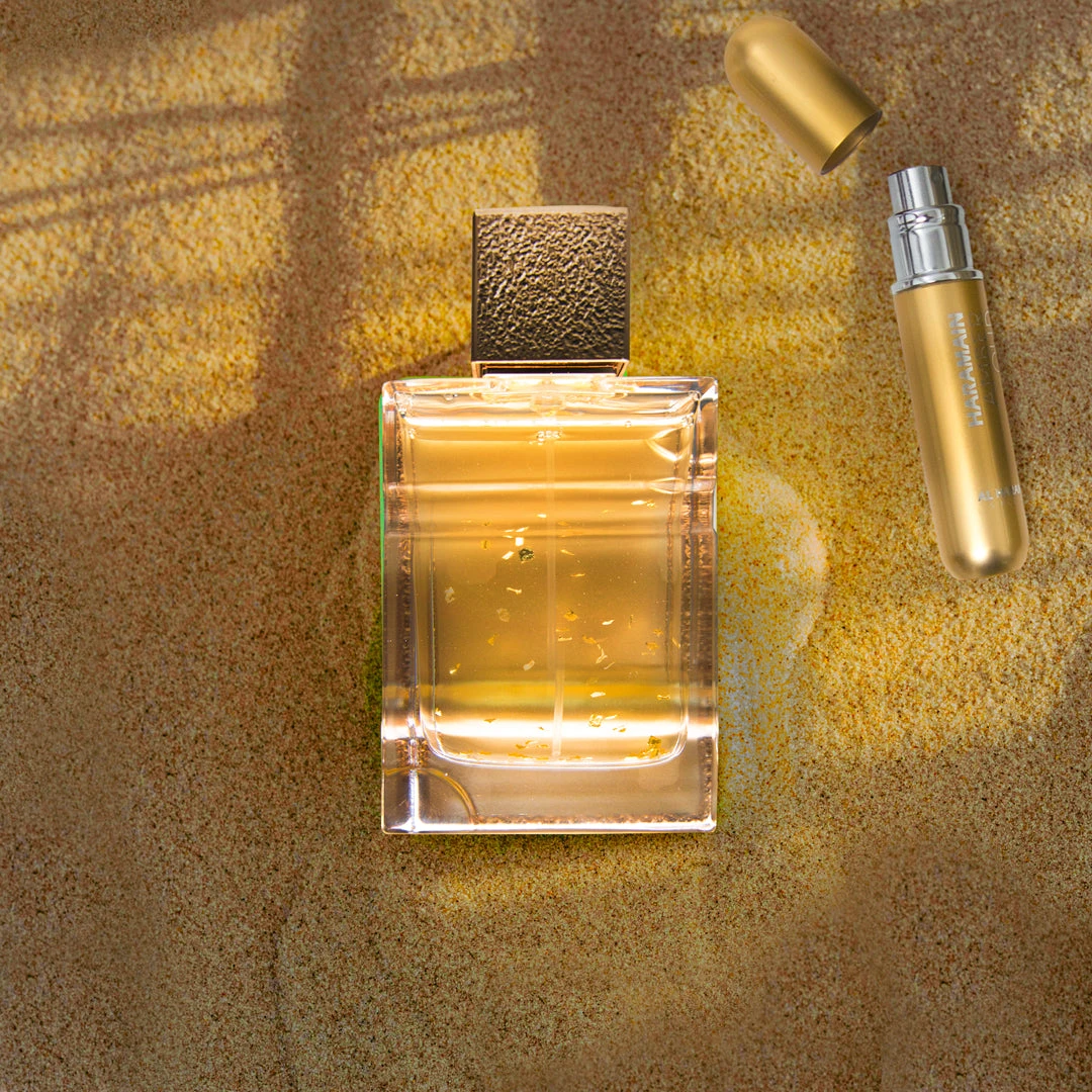 From the top notes of pear, orange, bergamot, and lemon to the heartwarming scent of melon, pear, jasmine, cardamom, caramel, and green apple, every note is a chapter in the captivating story of this metropolis. And, as you breathe in the grounding base notes of amber, vanilla, patchouli, and cedarwood, you’ll feel a sense of rootedness amidst the excitement. It’s a scent that invites you to immerse yourself in its captivating story and discover the true essence of Dubai, with a flourish of even more pure perfume and a sprinkling of gold flakes for a touch of luxury.