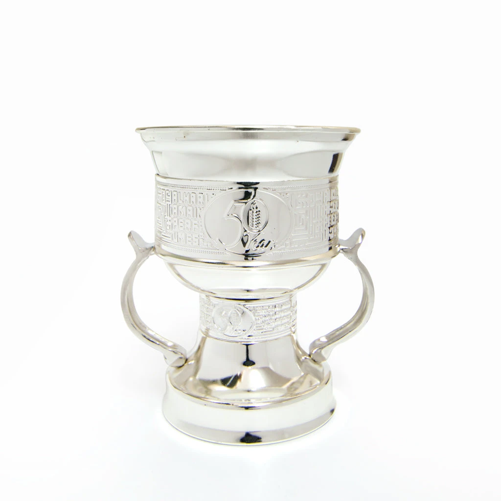 Bring a taste of the middle east and surround yourself with the relaxing aromas of Bukhoor with this special edition Al Haramain 50 Years trophy style medium metal burner in silver, complete with a removable perforated tray for burning coal.