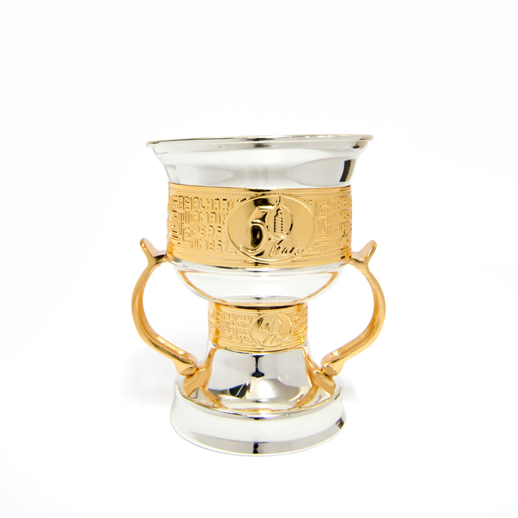 Bring a taste of the middle east and surround yourself with the relaxing aromas of Bukhoor with this special edition Al Haramain 50 Years trophy style medium metal burner in silver and gold, complete with a removable perforated tray for burning coal.