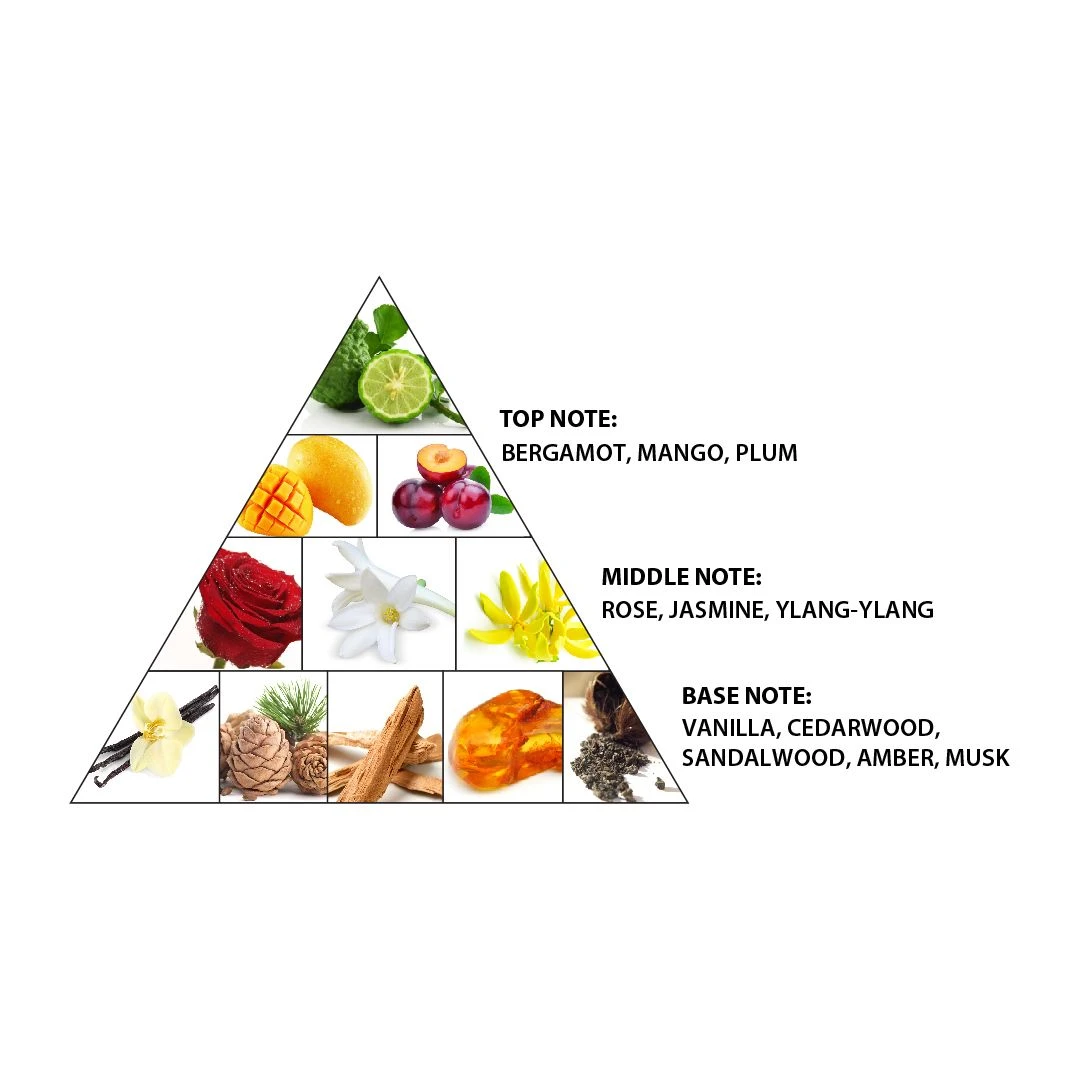 Base notes: Vanilla, Cedarwood, Sandalwood, Amber, Musk