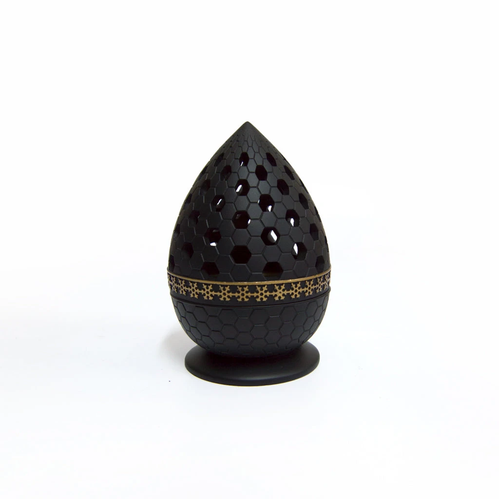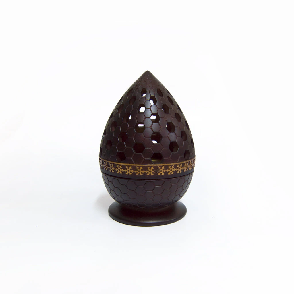 Bring a taste of the middle east and surround yourself with the relaxing aromas of Bukhoor with this Modern Teardrop Burner, with gold detailing on base, a removable perforated tray for burning coal, and a removable perforated Polyresin lid available in a range of colours.