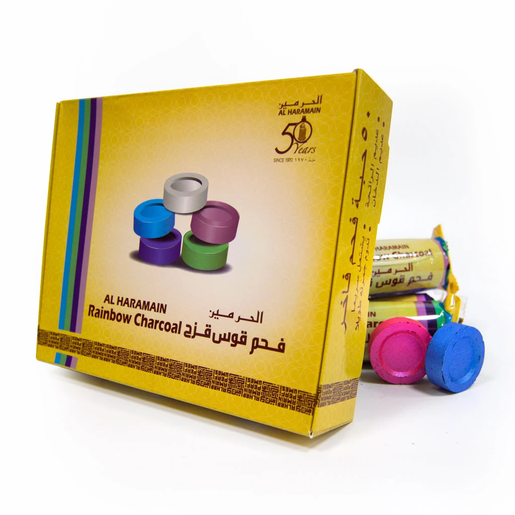 These instant-light, high quality Rainbow Charcoal tablets are ideal for use with your favourite incense and Bukhoor burner. Contains 5 packs of Silver, Blue, Purple, Pink and Green coal sealed in packs of 10 to maintain freshness. Each tablet is approximately 40mm in diameter and is odourless and long lasting and perfect for enjoying your favourite Bukhoor.